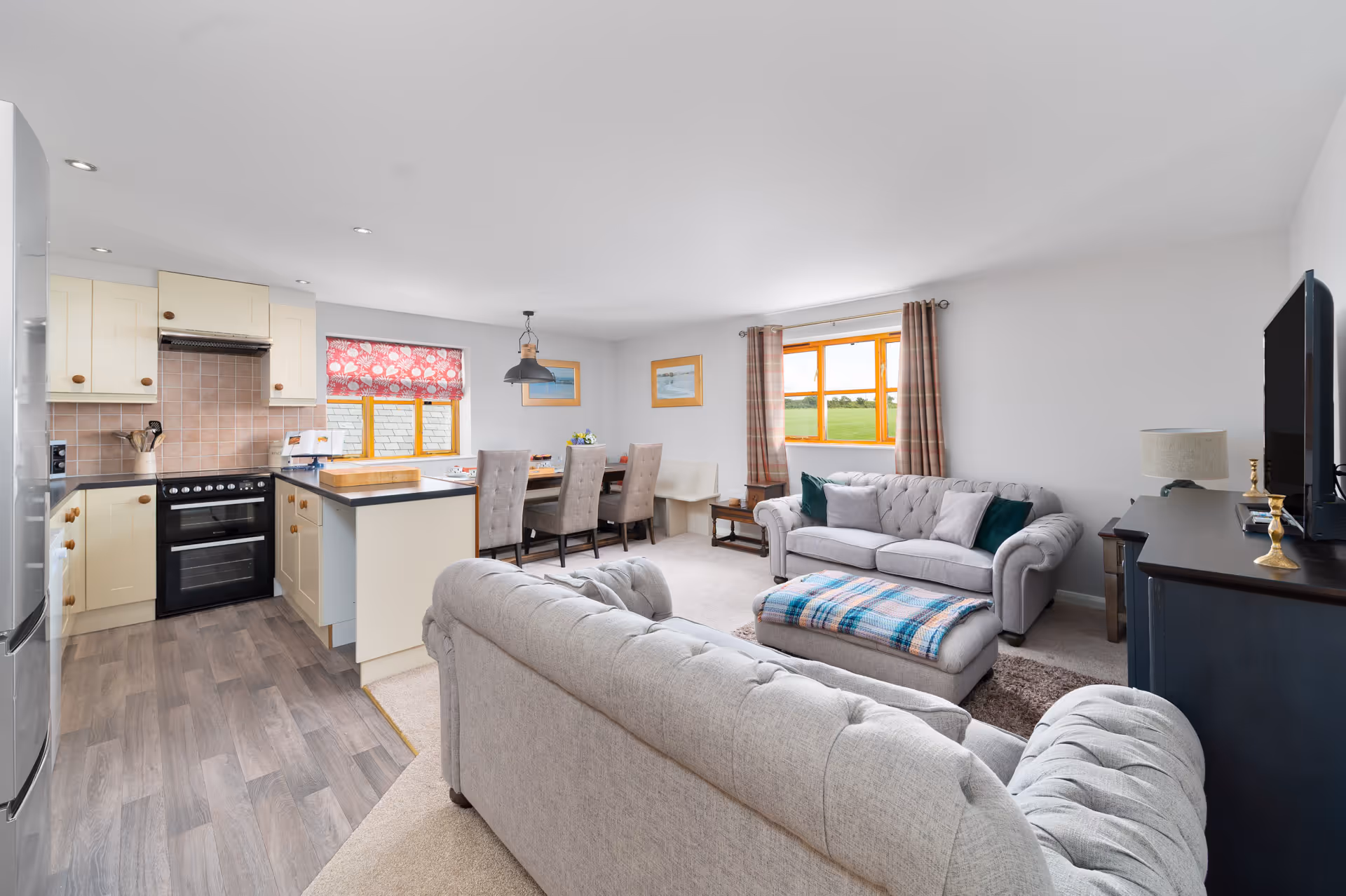The open plan living area is bright and airy with lots of space for friends or family to gather. Each area is cleverly designed and provides a wonderful homely atmosphere for guests. There is a comfy lounge with two sofas, A TV and a large DVD collection from which to choose your nightly film.