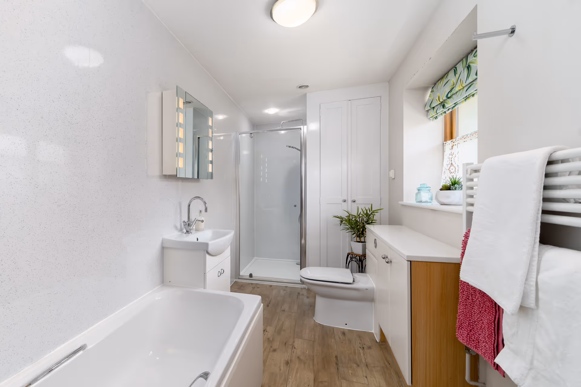 All three bedrooms share the family bathroom, which is fitted with a bath, a separate shower, a WC and a wash basin.